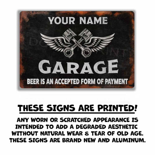 Personalized Rustic Black Garage Metal Sign Pistons and Wings - Wall Art Vintage Metal Sign 12" x 8”