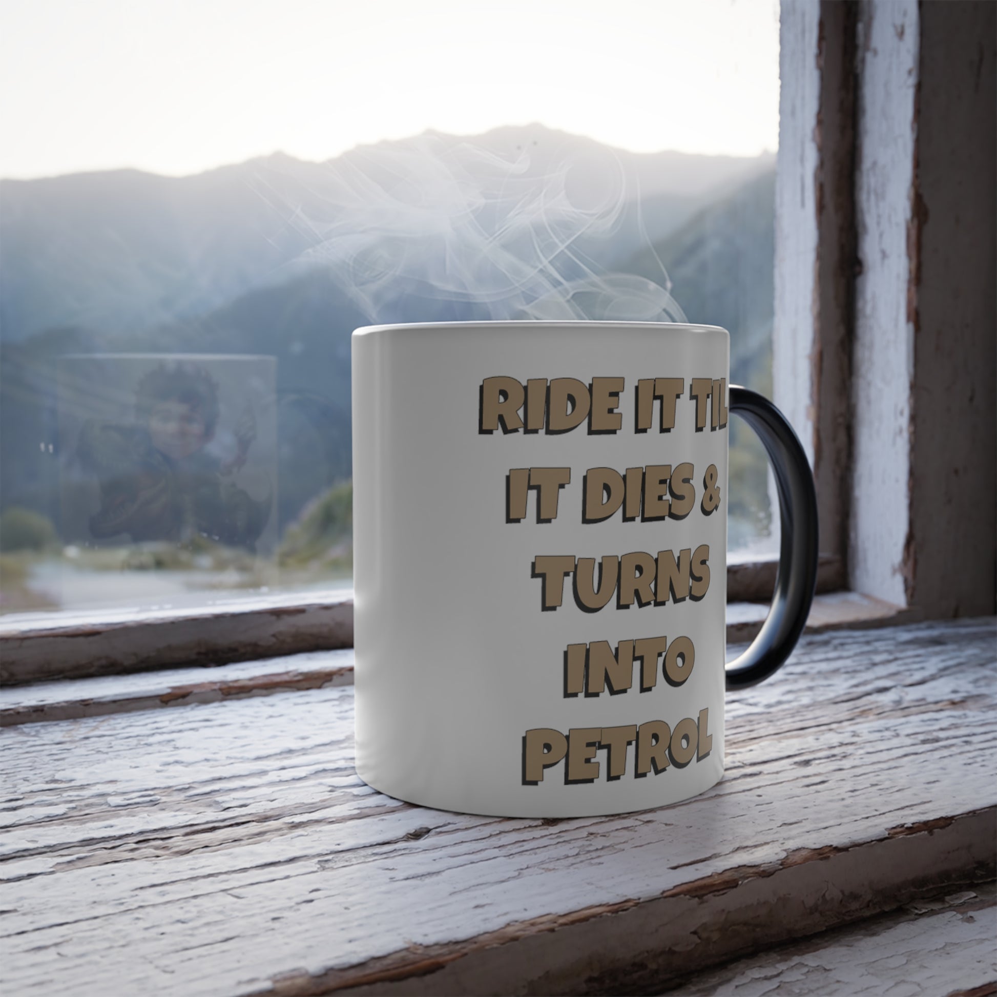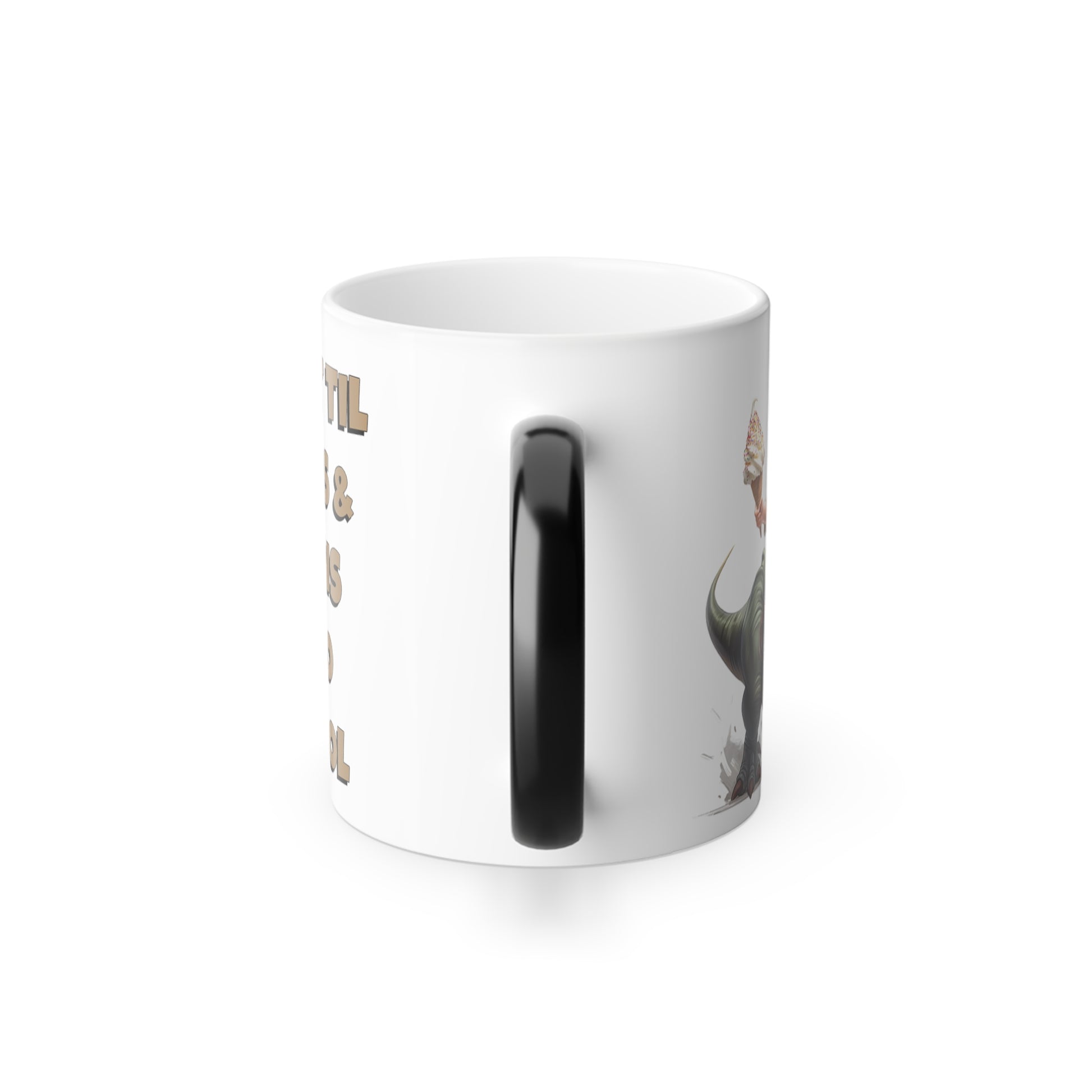 As you fill the mug with your favorite hot beverage, the heat sensitivity triggers the transformation, revealing a vibrant, hand-drawn caricature that perfectly captures a child's adventurous spirit riding a T-Rex. When the mug cools, it returns to its sleek black exterior and clean white interior, ready to amaze you again with the next refill.