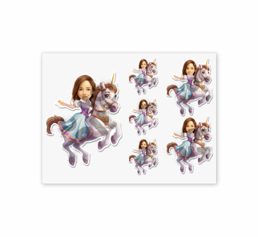 Personalize your world with our 6-Packs of Fantasy Caricature Decals featuring your Child Riding a Unicorn!